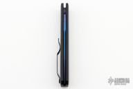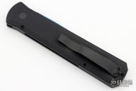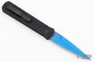 This Godfather by Pro-Tech features a Sapphire blue blade. The handle has a black aluminum frame with black hardware and black stainless steel tip up clip, abalone inlaid push button. Comes with original box and papers. Excellent condition.