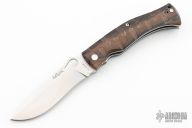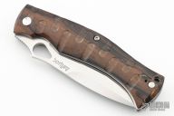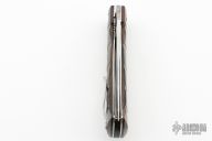 The Deimos is a Citadel designed folder from Fox Knives, it has been converted to a scale release d/a auto by Butch Vallotton. This folding knife is big on size, but feels and handles great thanks to excellent ergonomics and generous jimping on the flipper/guard and blade spine. The Deimos has a steel liner lock frame with Ziricote wood scales and a reversible tip-up carry pocket clip. The satin finished N690Co stainless steel blade has a plain cutting edge and false upper edge. The action and lockup on this mammoth knife is superb. The Deimos knife is outfitted with a Lake and Walker Safety, a secondary lock to ensure the blade stays open by blocking the release of the liner. If you're looking for a large folder that can tackle big and small jobs without missing a beat, this may be the knife for you!