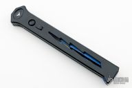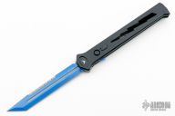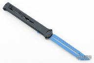 Joining the Estiletto OTF lineup is this fantastic model with a USA cutout on the black anodized aluminum body with black hardware/clip and a blue coated dagger blade with partially serrated cutting edges.