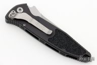 This Socom Elite Auto has a stonewash finished clip point blade with a standard edge. Black aluminum handle with non-slip inserts. Stainless steel clip, tip down carry. Glass breaker. Dated 06/2018 and s/n 0198. Comes with original box and papers. Excellent condition.