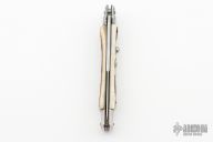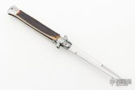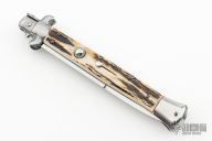 This swivel bolster auto by Italy features a tumbled and polished blade with a false top edge. The handle has stainless steel bolsters and butt, stag scales and brass liners. Strong opening. Has safety. Has some scratches, otherwise excellent condition.