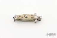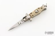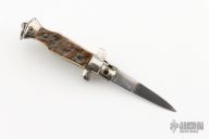 This auto features a spear point blade with a false top edge. Nickle silver guard and rear bolster and stag scales, brass liners. Nice function, strong firing. Has some light scratches, otherwise excellent condition.