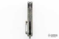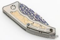 This Medusa by Heretic Knives features a Blued Vegas Forge Damascus multi-ground tanto blade with false top edge, notched thumbrest. The handle has a two-tone titanium frame with mammoth ivory inlays, titanium backspacer and a tip up clip with ceramic ball. Comes with original box, COA, zippered case and drawstring bag.  S/N 013 and dated 08/23.  New From Maker!