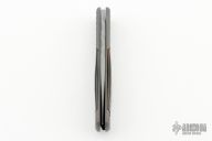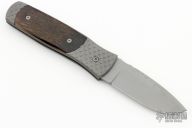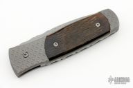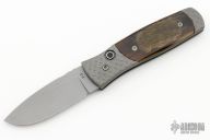 This Automatic by Z Custom Knives features a bead blasted drop point blade with fileworked thumbrest. The handle is comprised of a bead blasted titanium frame with cape buffalo horn inlays and inlaid push button over a fileworked stainless steel backspacer. Has some light scuffs and spots on the blade, otherwise good condition. Hard to find!