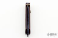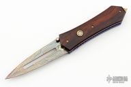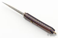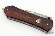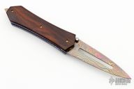 This D/A Auto by Nate Clark features a blued dagger ground Damascus blade with dual knurled yellow stone inlaid thumbstuds. The handle has ironwood scales, .223 REM push button, fileworked and anodized finish titanium liners with jeweled interiors, fileworked and anodized titanium backspacer with spiked tail. Nice action, lockup, detent and blade seating. Comes with a zippered case. Excellent condition.