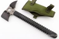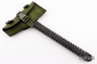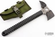 Strider says "The CR is designed to be a hard substance destruction tool. The materials and construction are intended to give optimum impact and prying strength. The CR works as a system. The base of which is a .285” thick 6AL4V titanium head, with .775” thick cantilevered S7 impact bits. S7 is an incredibly strong material, most commonly seen on “Jackhammer” bits. In addition to removing bolt stress, this cantilever action also allows for a multi strike action of the bits. The initial strike is achieved with human force by swinging the tool against a surface. The secondary strike is caused by the inertial force of the collapsing cantilever system. By using this system, the axe is actually working as a human powered Jackhammer. The user is protected both from impact shock, as well as electrical shock by a Delrin sleeve (handle) that fits over the titanium tang of the impact head. The sleeve is then filled with silicone which acts as a damper for impact vibration."