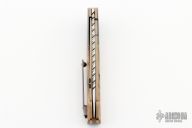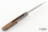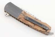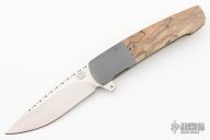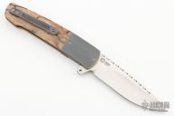This HB07 linerlock flipper by Herucus Blomerus features a hand rub satin finished blade with fileworked spine and flipper. The handle has Zirconium bolsters, spalted maple scales, anodized titanium liners with fileworked spines, spalted maple backspacer and a tip up 3D Zirconium clip. Blade is centered when closed, nice detent and lockup. Very smooth flipping action, rides on ceramic IKBS. Comes with a zippered case. Excellent condition.
