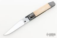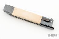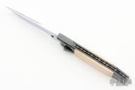 This Picklock Auto by Armenian Doctor Knives features a mirror polished flat ground blade. The handle has a blued stainless steel frame with fileworked stainless steel backspacer, mammoth ivory scales with brass pins. New from maker.  This one is a little tight and is still working in.