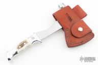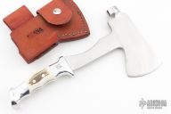 This Hatchet from Ruana knives features a satin finished head with hammer pole, of .344" blade stock and 2.75" blade depth, hidden tang construction. The handle is cast aluminum with elk antler inserts. Comes with original brown leather sheath. Excellent condition.