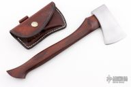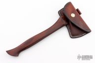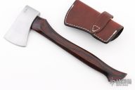 Very attractive belt axe with a great looking cocobolo handle. Head is hand forged by traditional blacksmith methods. The eye and poll are 1018 mild steel with a 1080 high carbon bit that is forged in. Edge is 2.375" long. Comes with leather sheath with belt loop. Excellent condition.