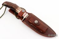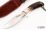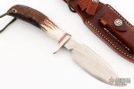 The Model 11 is the original drop-point blade. Designed by Tommy Thompson, noted Alaskan guide, in 1952 for big-game skinning, with point dropped below top of blade to prevent cutting too deeply through skins when used point first. The blade is satin finished with a notched thumbrest, .222" blade stock and 1.368" blade depth, hidden tang construction. The handle has a brass guard, stag handle, red/white/blue spacers, lanyard hole in the butt and a compass in the butt. Comes with a brown leather sheath with sharpening stone and a padded zipper case. Excellent Condition.