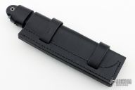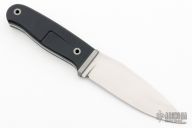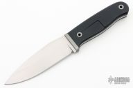 This knife by Rob Bayley features a hand rubbed satin finished blade.  .163" Blade Stock.  1.352" Blade Stock. The handle has black G-10 scales with a bead blasted titanium guard with a full tang construction. Includes a black leather sheath set up for horizontal carry. Marked " 22-18, #1".  Excellent Condition.