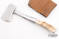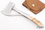 This No.2 Safety Axe by Marbles has been customized by Tom George. It has been mirror polished and has mammoth ivory grips. This "pocket axe" has a spring loaded safety guard that folds down into the handle.  Stamped only with the size No. 2 on the axe head, and marked "Marble - Gladstone, Mich., USA". Comes with a custom brown leather sheath. Excellent condition.