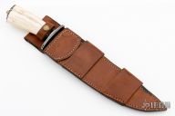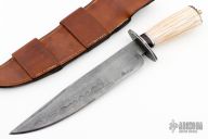 This Bowie by ABS Apprentice Randy Caston features a 3864 layer Damascus blade with false top edge, ..250" blade stock and 1.863" blade depth, hidden tang construction. The handle has a carved steel guard, walrus ivory grip with a wood spacer.  100 Layer Damascus buttcap. Includes a hand-tooled leather sheath. New from maker!