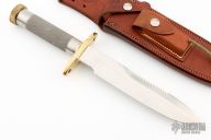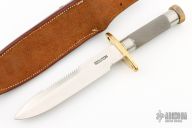 This Model 18-7.5 Attack Survival from Randall Made Knives has a spear point blade with sawteeth and sharpened top edge, .211" blade stock and 1.291" blade depth, hidden tang construction. The handle has a brass guard and knurled and butt cap, knurled stainless steel handle. Comes with a Rough Back brown leather sheath. Excellent condition.