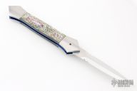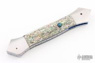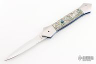 This Side opening auto by Burn Knives features a mirror polished dagger style blade with false top edge. The handle has stainless steel double bolsters, abalone scales over anodized titanium liners with jeweled interiors, fileworked aluminum backspacer. Excellent condition.