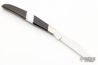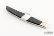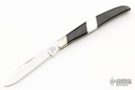 This Buck 303 features a mirror finished blade with nail nick. The handle has mirror polished nickel silver bolsters with integral liners, water buffalo and mother of pearl inlays, stainless steel backspacer. Comes with original leather sheath, box and papers. Excellent condition.