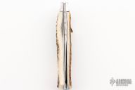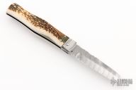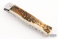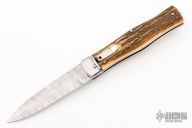 This lever auto from Mikov Knives has a Damascus spear point blade with false top edge. File-worked blade spine. The handle has polished stainless steel bolsters and liners, and stag scales. Excellent Condition.