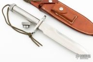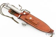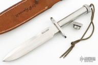 This Model 18-7.5 Attack Survival from Randall Made Knives has a spear point blade with sharpened top edge and sawteeth, .224" blade stock and 1.434" blade depth, hidden tang construction. The handle has a stainless steel guard and skull crusher style butt cap, smooth stainless steel handle. Comes with a brown roughback leather sheath and a zippered case. Excellent condition. Comes with a plain stainless steel butt cap as well.