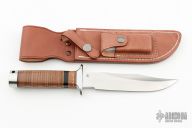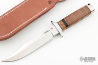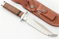 This SOG Bowie by Hattori features a satin finished bowie blade with false top edge, .275" blade stock and 1.180" blade depth, hidden tang construction. The handle is stacked leather with white spacers, and stainless steel double guard and butt cap with lanyard hole. Comes with brown leather sheath, original box and papers. New condition.