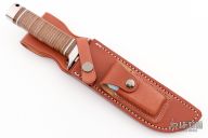 This SOG Bowie by Hattori features a satin finished bowie blade with false top edge, .275" blade stock and 1.180" blade depth, hidden tang construction. The handle is stacked leather with white spacers, and stainless steel double guard and butt cap with lanyard hole. Comes with brown leather sheath, original box and papers. New condition.