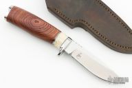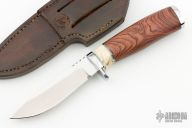 "In 1973 I started working for the British Columbia government as a wildlife control officer, hunting problem wildlife. Later I worked as a conservation officer. All my life I have hunted, fished, trapped and gunsmithed as a hobby, and knives have always been an important part of my life, from my bicycle trap line as a kid, to skinning problem wildlife when I worked as a wildlife control officer, to dressing the moose or deer I hunted for the freezer. I made my first knife in 1976, and in 1996 my wife Judy and I decided to go into the knife business full time. I make mostly upscale working hunting knives with a bowie or miniature now and again. Each knife is a unique combination of materials. Although I have used many different steels, I have found 440-C to be the most versatile. Heat treated to 57 Rockwell for optimum edge retention and ease of sharpening, this steel has proven itself in both working and collector knives. Other steels will be used for special order, and I enjoy using Damascus for collector pieces."
