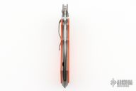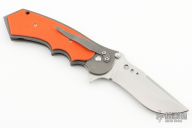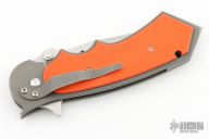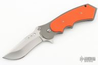 This flipper by John Kubasek features a fine bead blasted drop point blade, notched thumbrest, knurled thumbstuds. The handle has a bead blasted titanium frame with orange G-10 scales, bead blasted titanium tip down clip, titanium backspacer. Nice detent, lockup, action and blade seating. Comes with a zippered case. Has some scuffs and scratches, good condition.