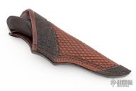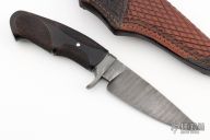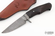 This Hunter by Journeyman Smith Ben Seward features a Ladder Pattern Damascus blade with .237" blade stock and 1.335" blade depth, hidden tang construction. The handle has a fluted Damascus guard, hand checkered African Blackwood grip with single pin. Comes with a hand tooled brown leather sheath with elephant hide overlay. Excellent condition.