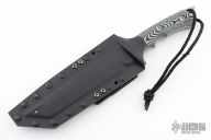 This Ultra Phalanx by Treeman Knives has a silver coated tanto blade with saw-tooth top edge and full tang, the top edge and sawteeth, 1/4" blade stock, 1-5/8" depth. Handle is black/white G-10 with matte-black finished stainless steel screws, and extented tang-butt glass breaker and lanyard. Has some scuffs, otherwise excellent condition. Comes with a kydex sheath.