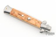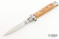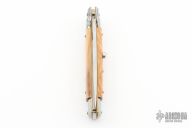 This 9" Swivel Bolster by Frank Beltrame features a mirror polished flat ground 4mm blade. The handle has polished nickel silver bolsters, front and rear, olive wood scales, brass liners and stainless steel spring. Excellent condition.