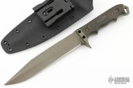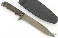 This Integral Fighter by Wilson Tactical features a green coated clip point blade with a false top edge. .253" blade stock and 1.250" blade depth, integral construction. The handle has an integral double guard, and black/green linen micarta scales. Comes with a kydex sheath with Tek-lok. Has some scuffs, otherwise good condition.