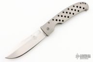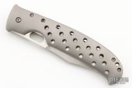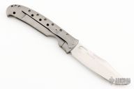 This XL TNT framelock by Tom Mayo features a hand rub satin finished Talonite blade with false top edge and thumbhole. The handle has a bead blasted titanium frame with hole pattern and a matching tip down clip, lanyard hole at the butt. Excellent condition. Nice detent, lockup and blade seating. #11 on blade. Comes with a zippered case. Dated 2002
