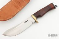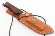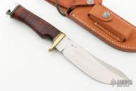 This Rick Bowles Special by Randall has a satin finished blade with false top edge and notched thumbrest, .213" blade stock and 1.431" blade depth, notched thumbrest, hidden tang construction. The knife carries the small Randall logo stamp and the backside is etched with "RBS 171". Guard is brass with a stacked leather grip, duralumin butt with lanyard hole, and black/brass spacers. Comes with brown leather sheath with "EEB" on the back. Has a small spot on the blade under the notched thumbrest, otherwise excellent condition.