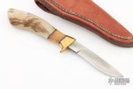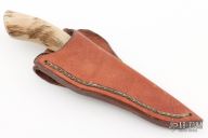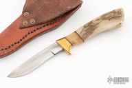 This Fawn by Butch Deveraux features a drop point blade with visible temper line, .144" blade stock and .684" blade depth, hidden tang construction. The handle has a brass guard with sheep horn grip and black spacers. Comes with a brown leather sheath. Excellent condition.