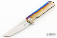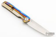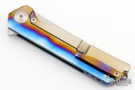 This Warrior 2 by Reate Knives is a Liong Mah design, it features a hand ground hand rub satin finished tanto blade with notched thumbrest, flipper and swedge. The handle has a milled and anodized titanium frame, matching titanium backspacer with lanyard hole and tip up titanium clip. Rides on bearings. Nice detent, lockup and blade seating. Comes with zipper case. Has some light scuffs and scratches, otherwise great condition.