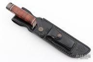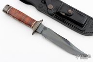 This S1 Bowie (Vietnam 5th Special Forces Group) has a black coated clip point blade with hidden tang and double guard. Blade width is just under 1/4", depth 1-1/4". Handle is contoured stacked leather with white spacers, black coated steel butt cap and lanyard hole. Comes with a black leather sheath. Very Rare. Blade is marked "SOG SPECIALTY KNIVES" on the presentation side. The non-presentation side has the Special Forces crest on the ricasso and "VIETNAM 5th Special Forces Group" on the swedge.  Excellent condition. Come swith original box and sheath.