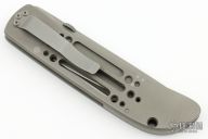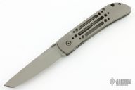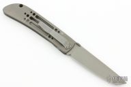 This linerlock folder by Crawford Knives features a bead blast finished tanto blade with thumbdisc and a bead blast titanium frame, liner and stainless steel backspacer and tip down clip. Smooth action, nice detent, blade seating and lockup. Has some light scuffs, otherwise excellent condition. Comes with a nylon velcro case.