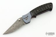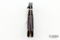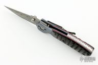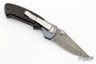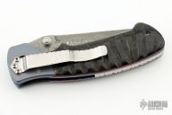 This Mini Kasper from Pat and Wes Crawford features a Damascus blade with false top edge and dual thumbstuds. The handle has anodized and dovetailed titanium bolsters, jigged horn scales with red liners, anodized titanium liners, fileworked stainless steel backspacer and tip down clip. Nice lockup and blade seating. Comes with a nylon sheath. Excellent condition.