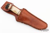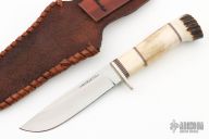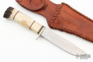 This Morseth Stag Hunter has a satin finished clip point blade with hidden tang, .173" blade stock and 1.054" blade depth. Handle is stag antler with a nickel silver guard and black, white and red spacers. Comes with custom Morseth brown leather sheath with belt loop. Has some scratches and light staining on the blade, otherwise good condition.
