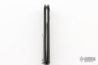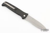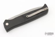 This Militia Auto by Rob Dalton features a bead blast finished partially serrated blade and a black anodized aluminum frame with safety. Titanium clip, tip up carry. Powerful coil spring action. Has some scuffs, otherwise excellent condition. #20229