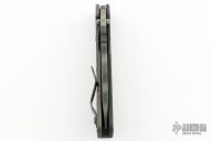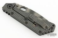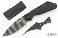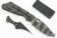 This SMF framelock folder by Mick Strider features a tiger striped drop point blade with a notched thumbrest.  The handle features a textured G-10 scale and a flamed titanium lockside with a matching tip up pocket clip. New condition. Comes with a black steel tool with kydex sheath.
