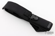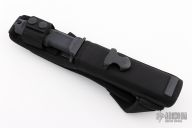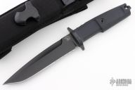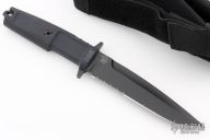 This Col Moschin Fighter has a matte black N690 Cobalt stainless steel partially serrated drop point double-edged blade with hidden tang and notched thumb rest. Blade width is 1/8", depth 1-1/4". Handle is black non-slip Forprene with lanyard hole. Comes with black sheath with double button-nylon closure and nylon leg straps. Excellent condition.