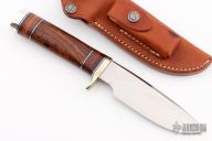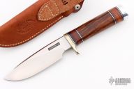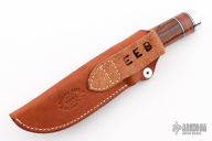 The Model 25-5 by Randall Made Knives is a drop point hunter similar to Model 11, but handle construction is reminiscent of 1930′s design. Excellent skinning, outdoors knife. This knife has a carbon steel blade with notched thumbrest, .208" blade stock and 1.368" blade depth, hidden tang construction. The handle nickel guard and duralumin pommel, desert ironwood grip with stacked leather, black and duralumin spacers. Comes with brown leather sheath. Excellent condition. Has EEB on the back of the sheath.