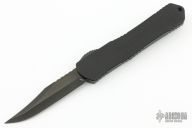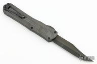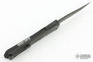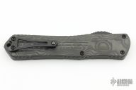 This Manticore-X by Heretic Knives features a black DLC bowie blade with notched thumbrest. The handle has a black aluminum frame with purple camo carbon fiber back cover, black stainless steel hardware and black tip down clip, and titanium thumbslide. Comes with original box, papers and sample tube of OTF Lube. S/N 015. Excellent condition.