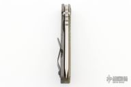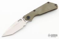 This SNG framelock folder by Mick Strider features a stonewashed tanto blade and a dimple pattern green G-10 and flamed titanium frame and tip up titanium clip. Includes a "Lock Bar Stabilizer" for maximum reverse lock retention. Nice detent, lockup and blade seating. New condition.