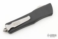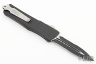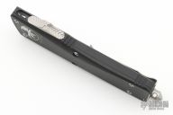 This Combat Troodon OTF automatic features a black D/E blade with partially serrated edges. Black aluminum handle with a tip down blasted stainless steel clip. Glass breaker. Serial number 06382 and dated 04/2010. Excellent condition. Comes with a nylon sheath.