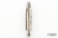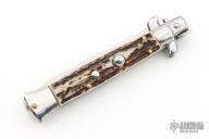 This 9" Swivel bolster auto by Armondo Beltrame features a mirror polished Kris blade with false top edge. The handle has stainless steel bolsters, front and rear, stag scales, brass liners, stainless steel backspacer and spring. Nice action, lockup and blade seating. Has safety. Excellent condition.