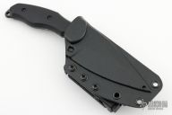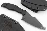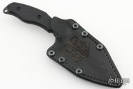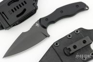This SB1 by Fox Cutlery is a Borka Blades design, it features a black blade with false top edge and notched thumbrest, .199" blade stock and 1.545" blade depth, full tang construction with black g10 scales. Comes with kydex sheath with belt clip and original box. Has some light sheath marks, otherwise excellent condition.  Comes with a black leather sheath by Chattanooga Leatherworks.