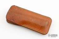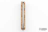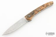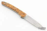 This slipjoint by Le Chignore features a Damasteel blade. The handle has burl wood covers, stainless steel liners and fileworked stainless steel spring. Comes with a leather slip that shows some wear. Excellent condition.