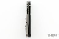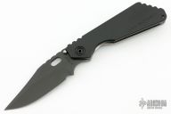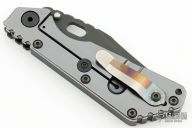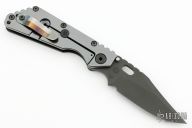 This Mick Strider SMF Bowie framelock folder features a black blade with thumbhole and notched thumbrest. The handle has a black aluminum and an anodized titanium frame with titanium clip, tip up carry, lockbar stabilizer. Jimping on blade spine. Nice lockup, detent, and blade seating. New condition.